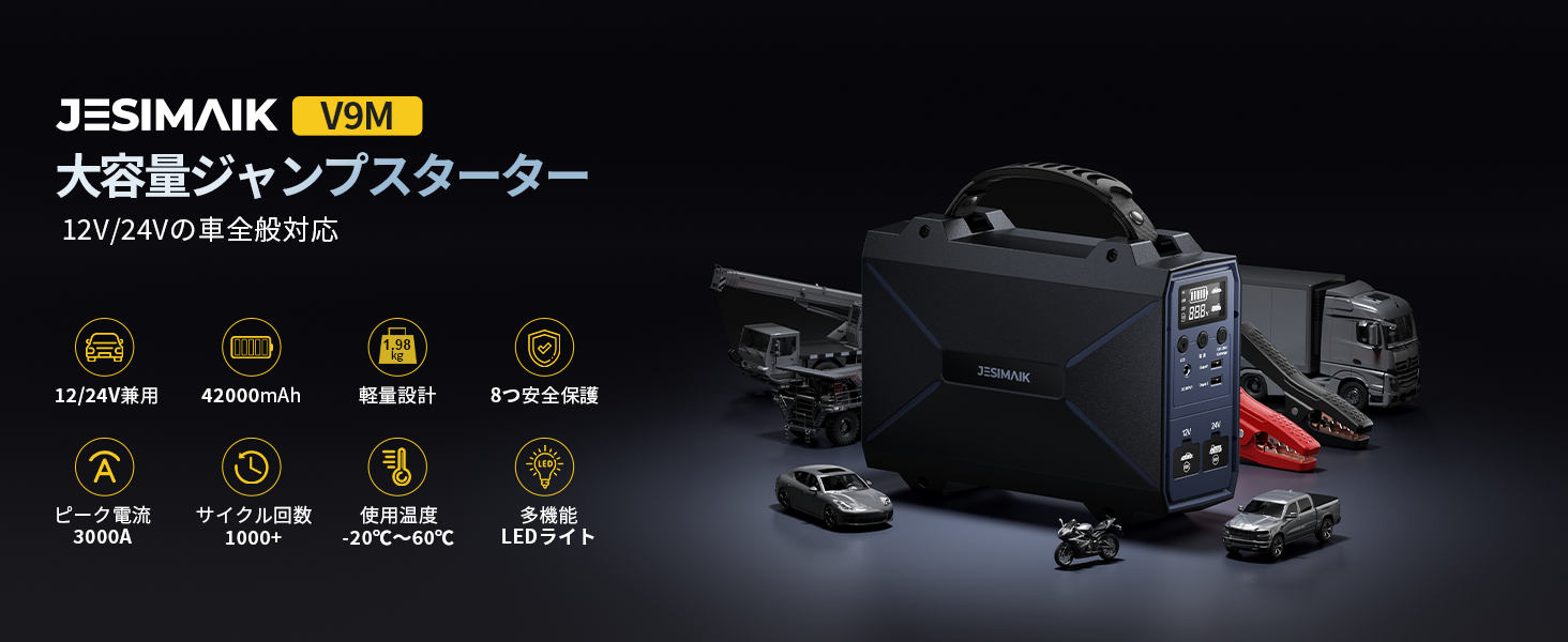 JESIMAIKは、12V/24V両対応の多機能ジャンプスターター「V9M」を2025年12月3日からオンラインで販売しています。始動電流1500A、ピーク電流3000Aを備え、42000mAhの大容量バッテリーにより、12V車で60回以上、24V車で30回以上のエンジン始動が可能としています。