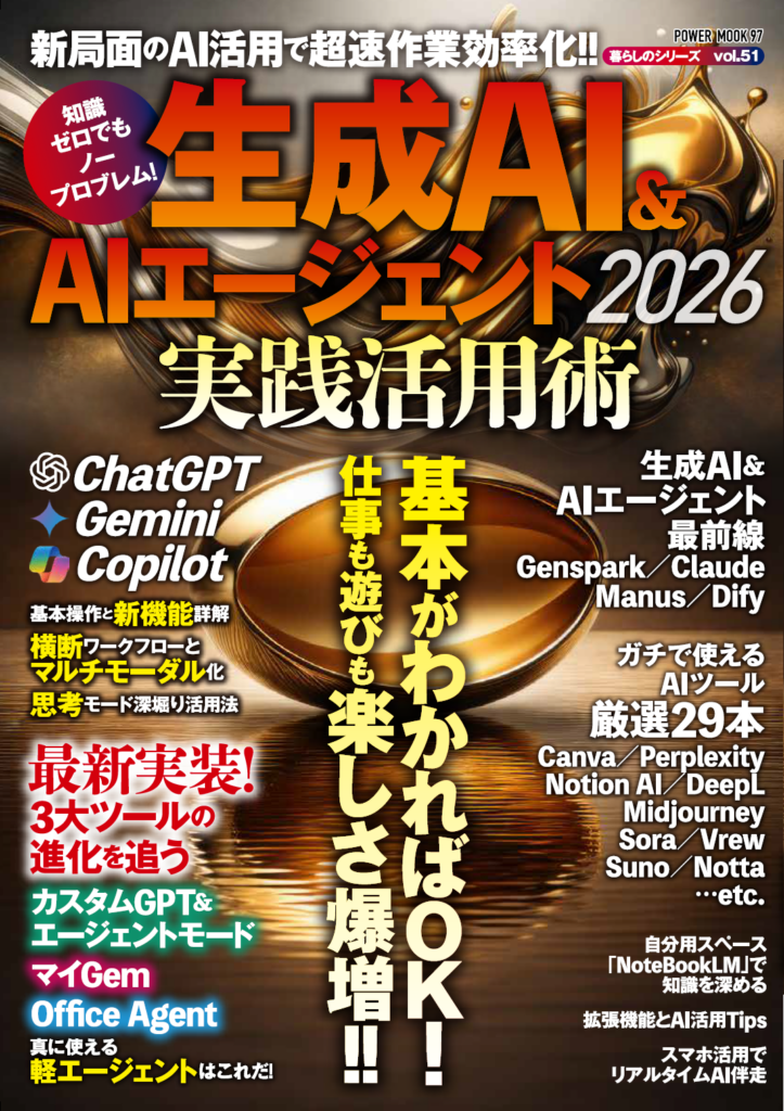 内容は、ChatGPT、Gemini、Copilotなど主要生成AIの基礎と最新機能に加え、近年注目が高まる「AIエージェント」を解説します。AIエージェントは、指示に基づき複数の作業を段取りして進める仕組みで、同書では「できること/できないこと」を整理し、流言に惑わされない理解を促す構成としています。