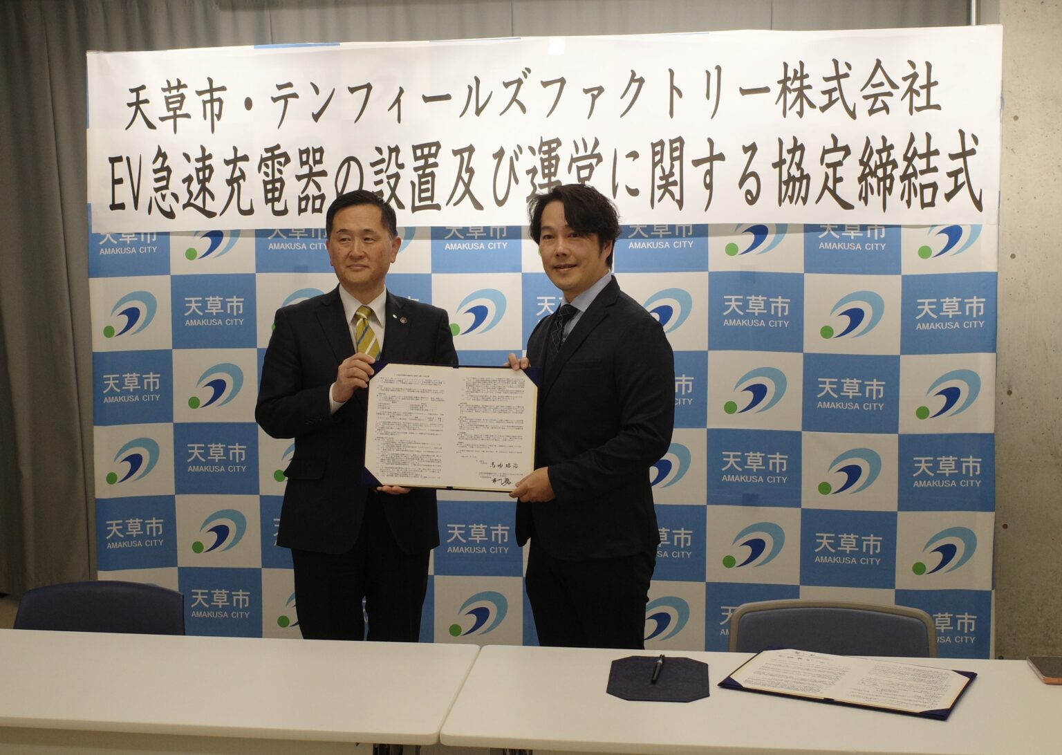 熊本県天草市は2026年1月28日、テンフィールズファクトリーとEV急速充電器の設置・運営に関する協定を結び、市内3カ所に急速充電器「FLASH」を設置し運営すると明らかにしました。導入機種は最大出力240kWの「FLASH Mark.6」です。