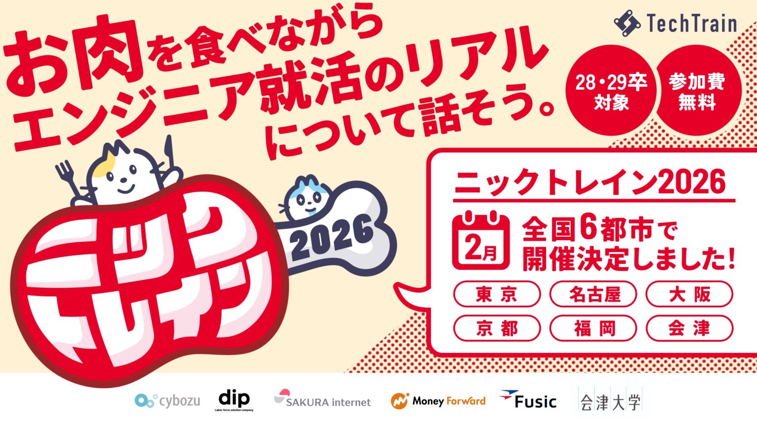 TechBowlが運営するTechTrainは、エンジニア志望の学生向けキャリアイベント「ニックトレイン」を2026年2月に東京・名古屋・京都・大阪・福岡・会津の全国6都市で開く。対象は2028年卒・2029年卒で、協力はサイボウズ、dip、マネーフォワード、さくらインターネット(Blooming Camp)、Fusic、会津大学が担う。イベントは就活解禁前の2月〜9月の過ごし方をテーマに、先輩の就活体験談やスキルアップ方法を学び、学生同士や現場エンジニア、採用担当者との交流機会を提供する。昨年度は全国5都市で実施し、累計約130人が申し込み、満席やキャンセル待ち会場も出たという。イベントページは順次公開予定で、最新情報はTechTrainの公式Connpassで告知される。今後は全国で同様の学生向け企画を広げ、育成とキャリア形成支援を継続する方針です。