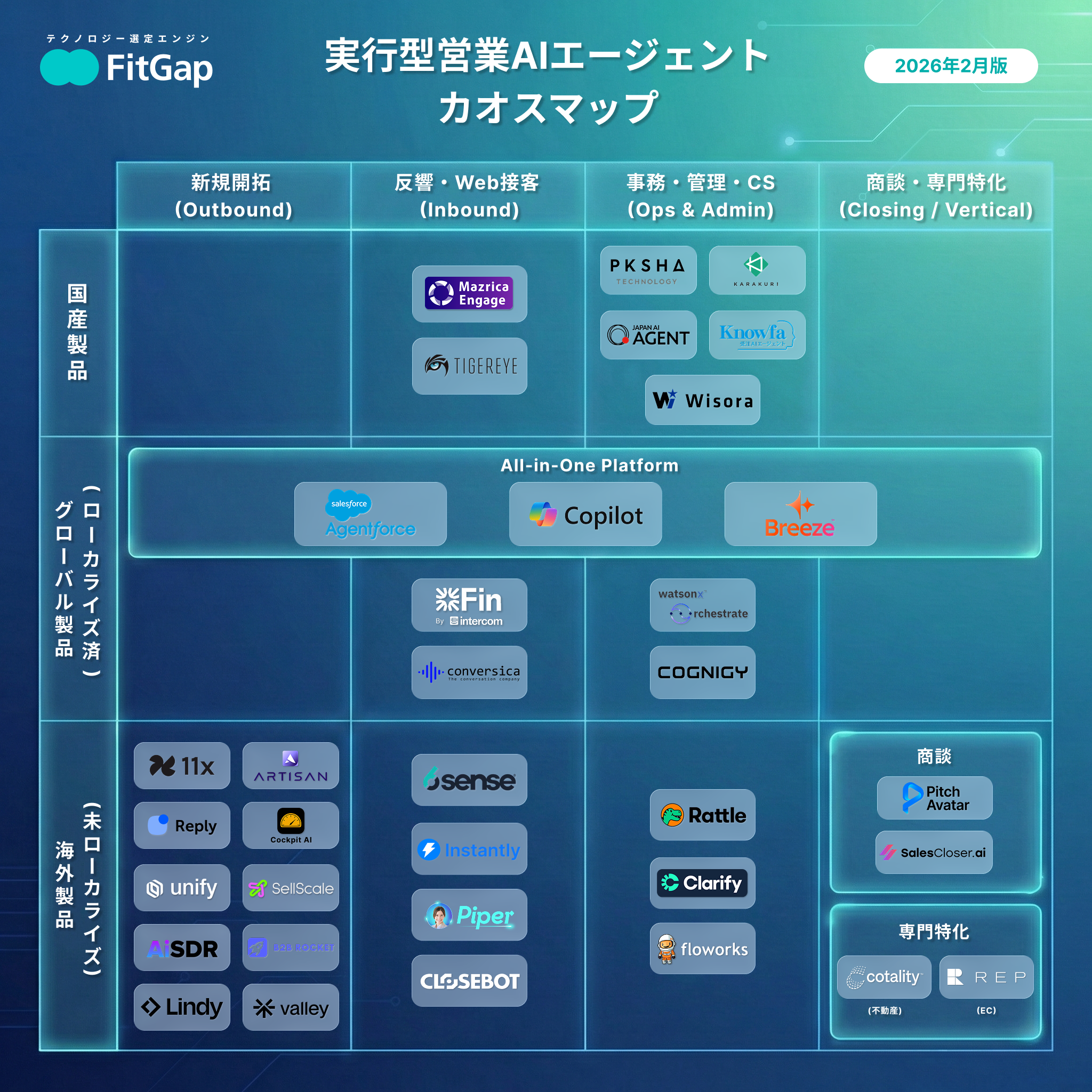 【2026年最新版】実行型営業AIエージェント カオスマップ|国内外100超から35製品を厳選