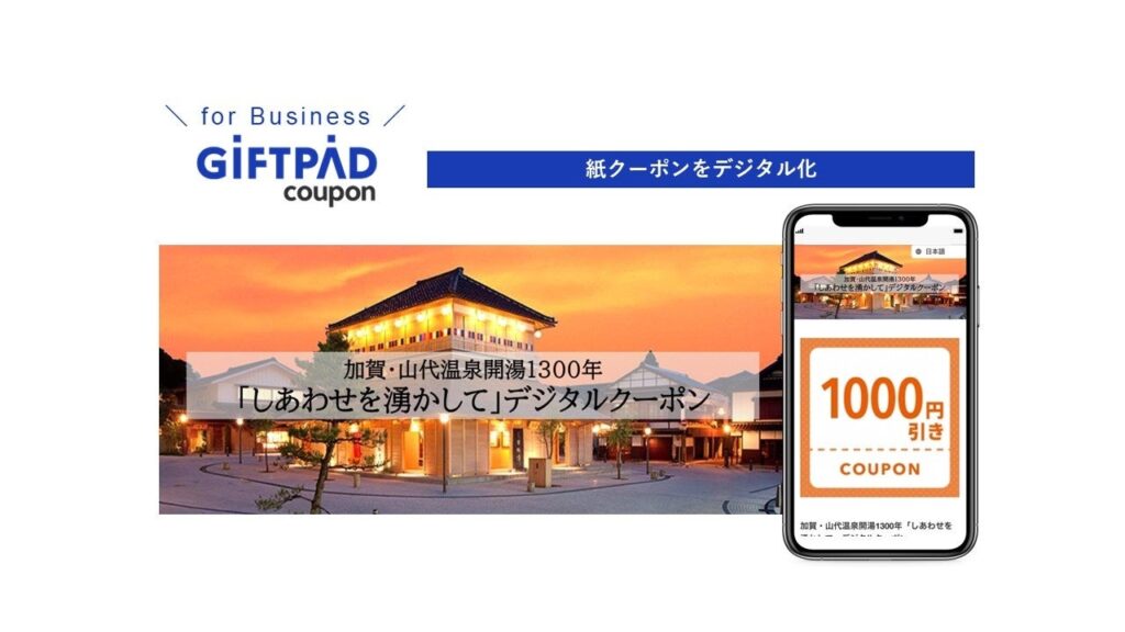 企業や自治体のDX支援を行うギフトパッドのデジタルクーポン「Giftpad coupon」が、石川県加賀市の山代温泉観光協会による「山代温泉開湯1300年『しあわせを湧かして』」キャンペーンに採用され、1,000円券3枚つづり・計3,000円分の周遊クーポンとして宿泊プランに付与されます。クーポンは温泉街の複数店舗で利用でき、土産店や飲食店、日帰り入浴施設などへの来店を促すことで、地域内での消費拡大と回遊性の向上を狙います。