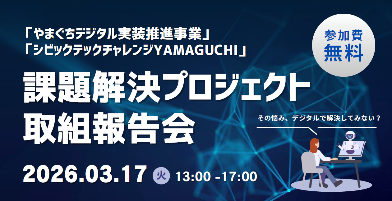 山口県は3月17日13時~17時、官民連携の「シビックテック チャレンジ YAMAGUCHI」で進めた実証実験8プロジェクトの成果報告会を、山口市のニューメディアプラザ山口とオンラインで開催し、参加者を募集します。現地定員は先着100人で、参加費は無料、申込締切は3月13日です。
