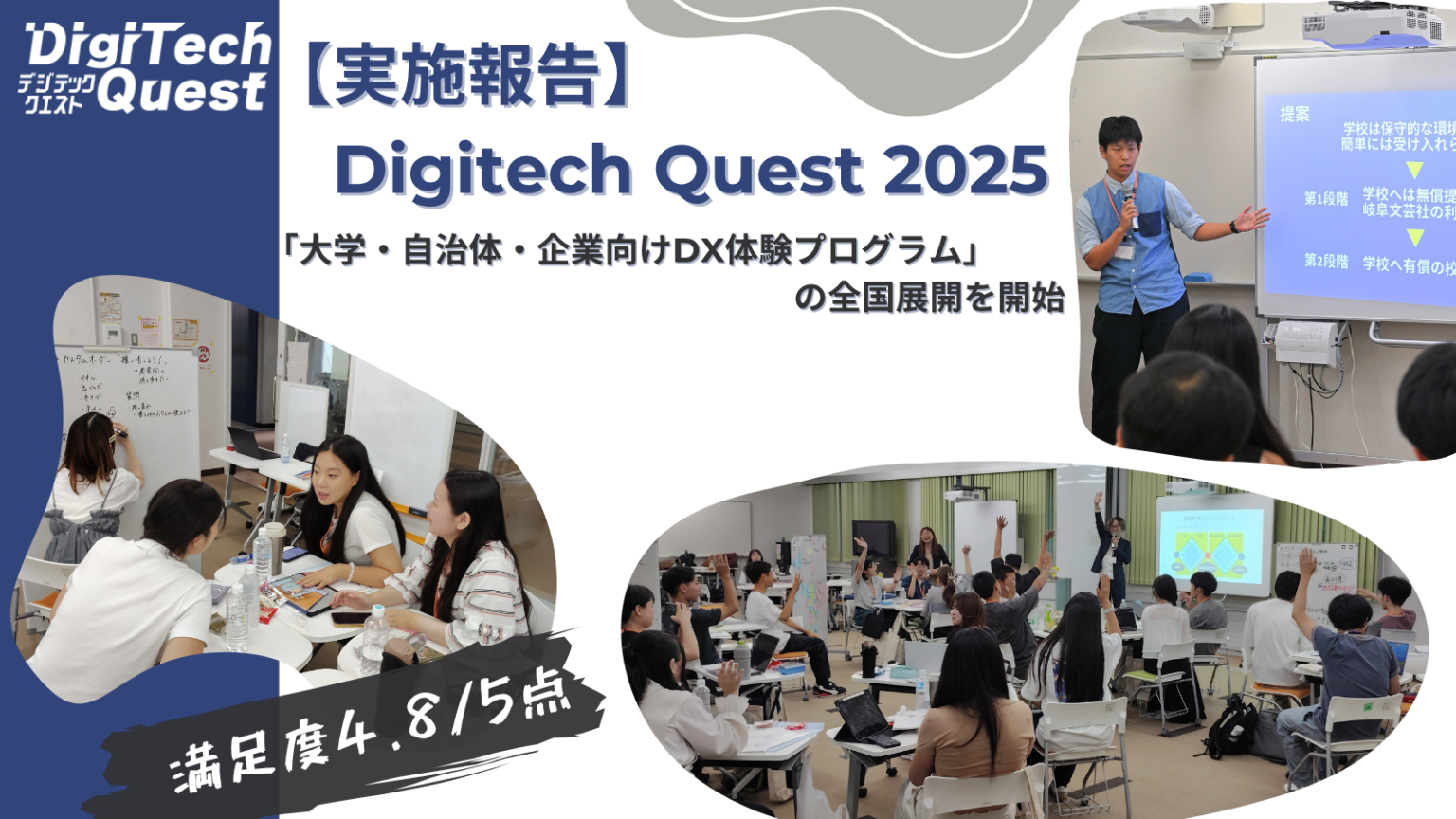 岐阜大学で行われた産学連携DXプログラム「Digitech Quest 2025」が終了し、参加学生の満足度は5点満点中4.8、94.7%が「将来のキャリアに役立つ」と回答したことが分かりました。参加した18人の国立大学生・大学院生・高専生らは、実在企業のデジタルトランスフォーメーション(DX=デジタル技術で業務やビジネスを変えること)課題に2週間で取り組みました。