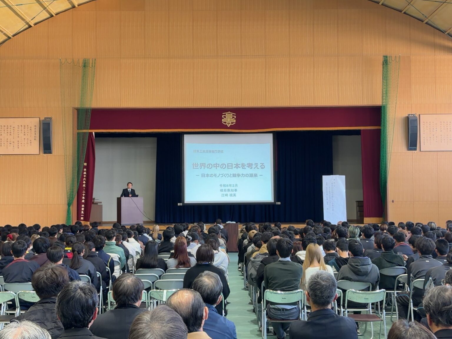 岐阜工業高等専門学校(岐阜県本巣市)で令和8年2月4日、岐阜県知事の江崎禎英氏が講演し、学生や地域企業関係者など約600人が聴講しました。テーマは「世界の中の日本を考える~日本のモノづくりと競争力の源泉~」です。