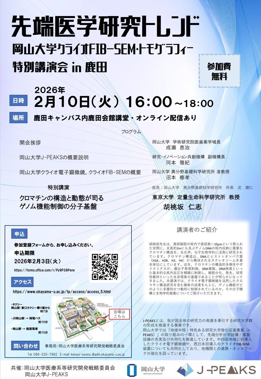 特別講演は東京大学定量生命科学研究所の胡桃坂仁志教授が担当し、クロマチン(DNAとタンパク質の複合体)の構造と動態から、ゲノム機能制御の分子基盤を扱います。座長は岡山大学異分野基礎科学研究所の沈建仁所長が務めます。