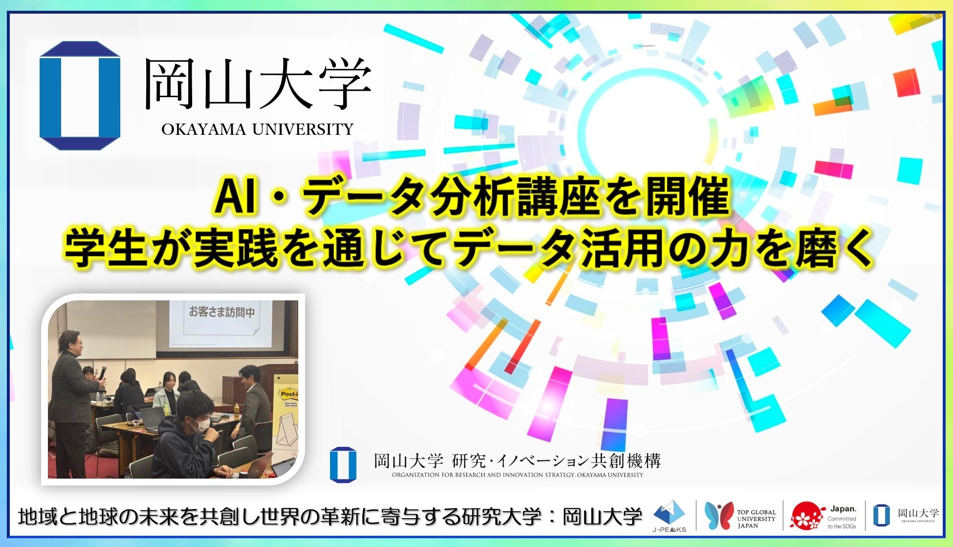 岡山大学(岡山市北区)は2026年2月12日から17日にかけて、津島キャンパスで岡山県内の大学生を対象に「AI・データ分析講座」を開きます。プログラムは全3回で、AIとデータ分析の基礎から実データを用いた実践までを扱います。