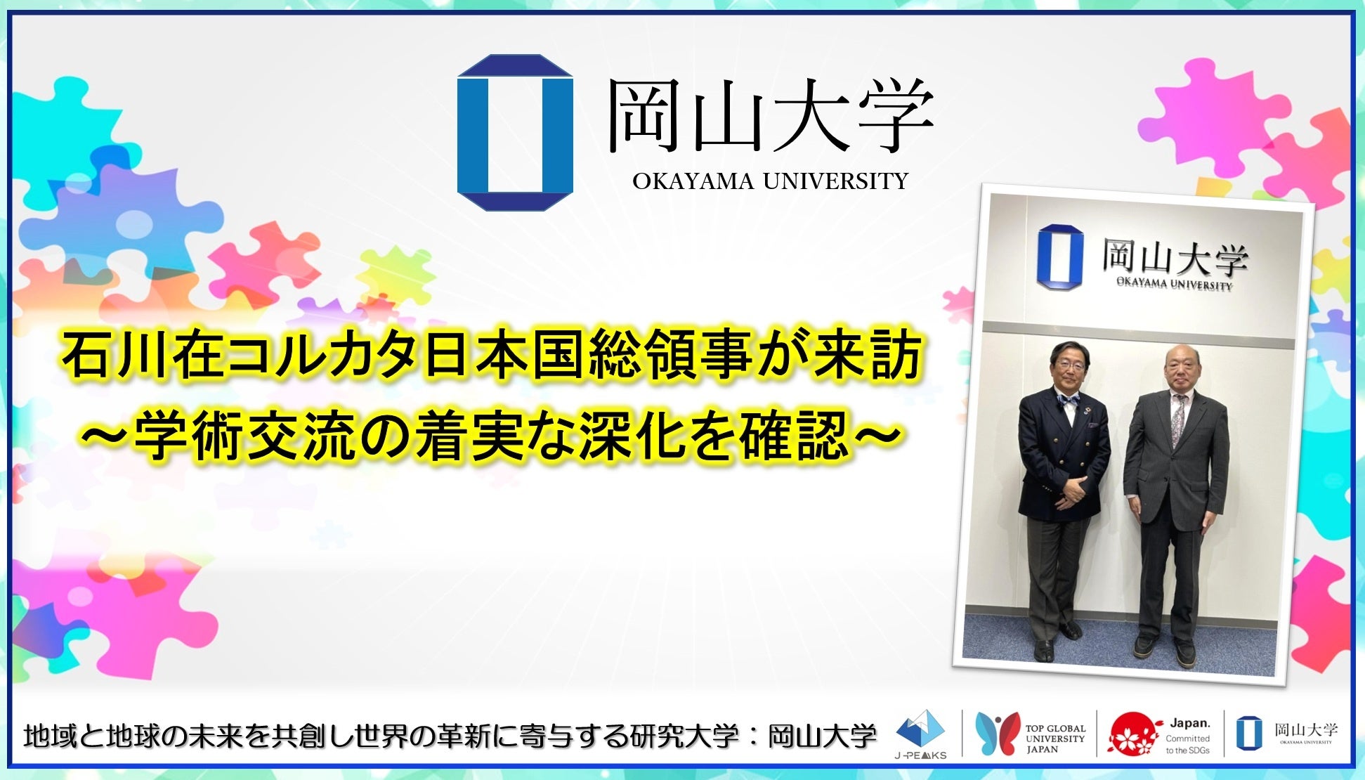 岡山大学は2026年1月7日、在コルカタ日本国総領事の石川義久氏を岡山市北区の大学本部で迎え、那須保友学長と面会した。インド西ベンガル州を中心とした学術交流の現状確認と、今後の連携方針を話し合った。これまでの感染症研究や地球科学分野の研究協力、学生交流の進展を共有し、現地の政治状況も踏まえた継続の在り方を議論した。シスター・ニヴェディター大学、プレジデンシー大学などコルカタ周辺の大学との関係深化も俎上に載せた。石川氏は長年の交流を評価し、将来的に自治体を含む連携へ広がる可能性に期待を示した。那須学長は、惑星物質研究所のインターンシップにインドからの応募が増えていると説明し、教育・研究両面で協力を深める意向を述べた。岡山大学は西ベンガル州との交流を発展させ、国際共同教育・研究を推進する方針だ。