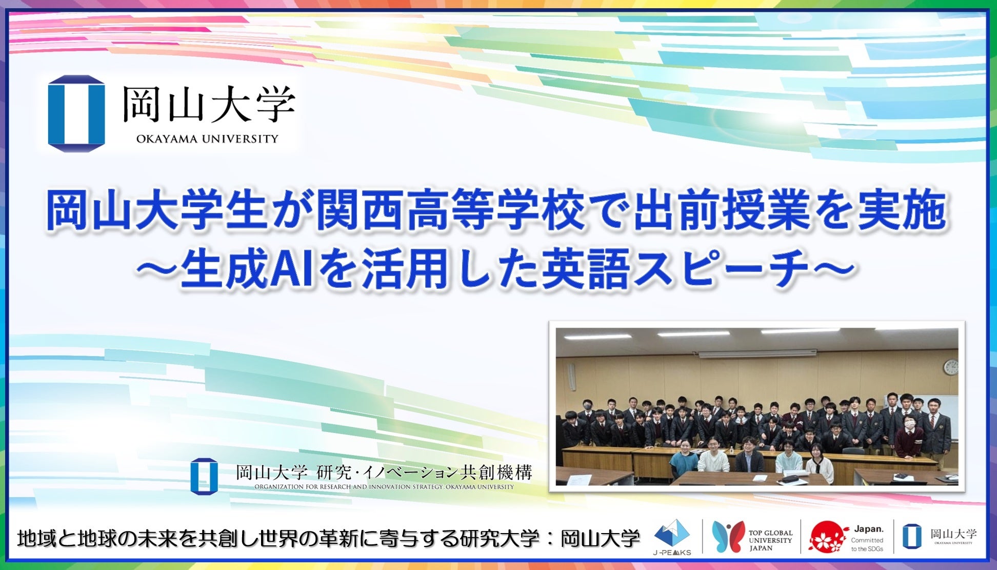 岡山大学データサイエンス部(DS部)の学生が講師となり、2026年1月29日に関西高等学校で「生成AIを活用した英語スピーチ」をテーマとする出前授業を行いました。県内高校での実施は倉敷青陵高、岡山学芸館高に続く3回目です。