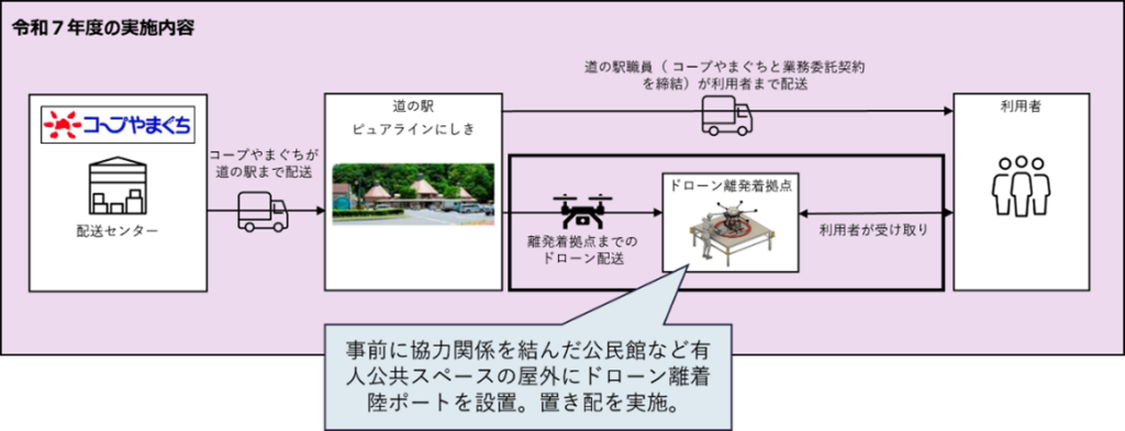 取り組みは農林水産省の「令和6年度 物流生産性向上推進事業」で、間接補助事業者として2025年12月に採択された。道の駅や公民館などを拠点に、食品・日用品・医薬品などの配送でドローンを活用し、住民の移動コストと物流コストの抑制、流通量の増加を狙う。