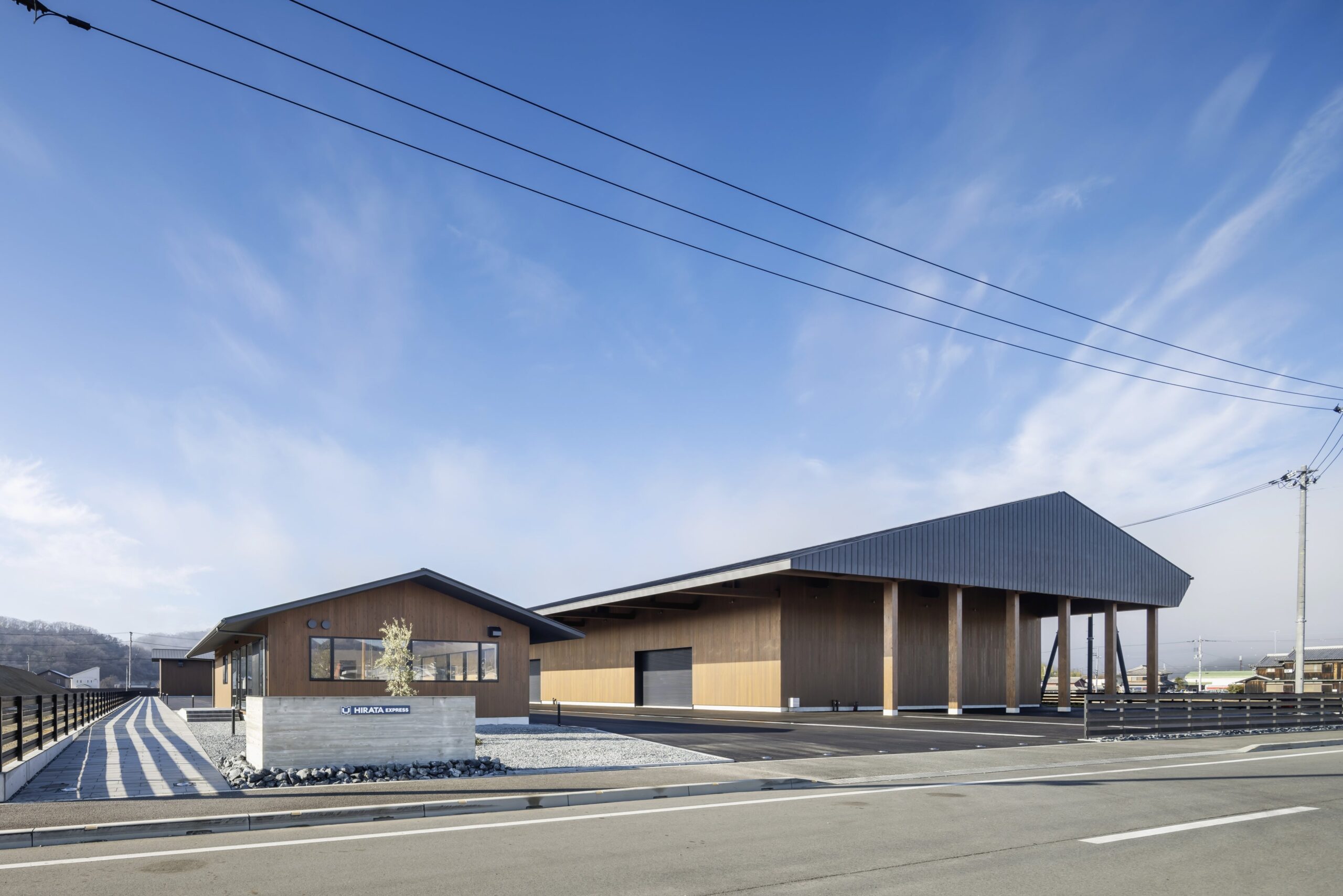 中核となる倉庫棟はトラス工法により柱のない空間を確保し、梁下高さは約9mです。構造材は39cm角で、同社は大阪・関西万博の大屋根リングと「ほぼ同サイズ」としています。事務所棟は約40坪、休憩棟は約22坪で避難場所としても機能する多目的スペースを設けました。車両看板作業棟(約44坪)ではトラック看板塗装の内製化を進め、外部向け提供も視野に入れます。