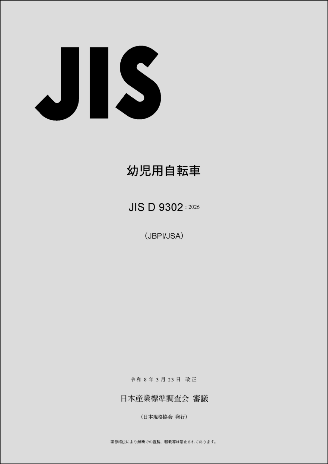 日本規格協会は2026年3月23日、幼児用自転車の日本産業規格「JIS D9302:2025」を発行しました。回転部への指の巻き込まれ防止、グリップの安全性評価(パンチアウト試験)の追加など、安全要件を強化しています。規格票はA4判74頁で、税込価格は11,660円です。