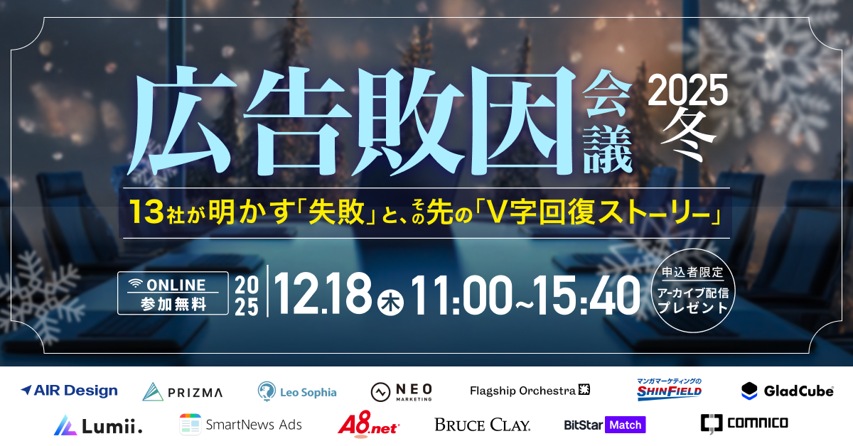 内容は「なぜ失敗したか(敗因分析)」と「どう回復したか(V字回復)」を、戦略・クリエイティブ・運用の3視点で深掘りします。CPA(1件獲得あたりの広告費)の高騰や成果の頭打ちなど、原因特定が難しい課題に対し、属人的な勘に頼らずデータやテクノロジーで再現性を高める考え方を共有する場とします。登壇にはSmartNews Ads、アフィリエイト、インフルエンサー施策、SNS分析、生成AI活用などの実務担当者が参加予定です。今後は、失敗事例の体系化が次年度の広告投資判断に影響を与える可能性があります。