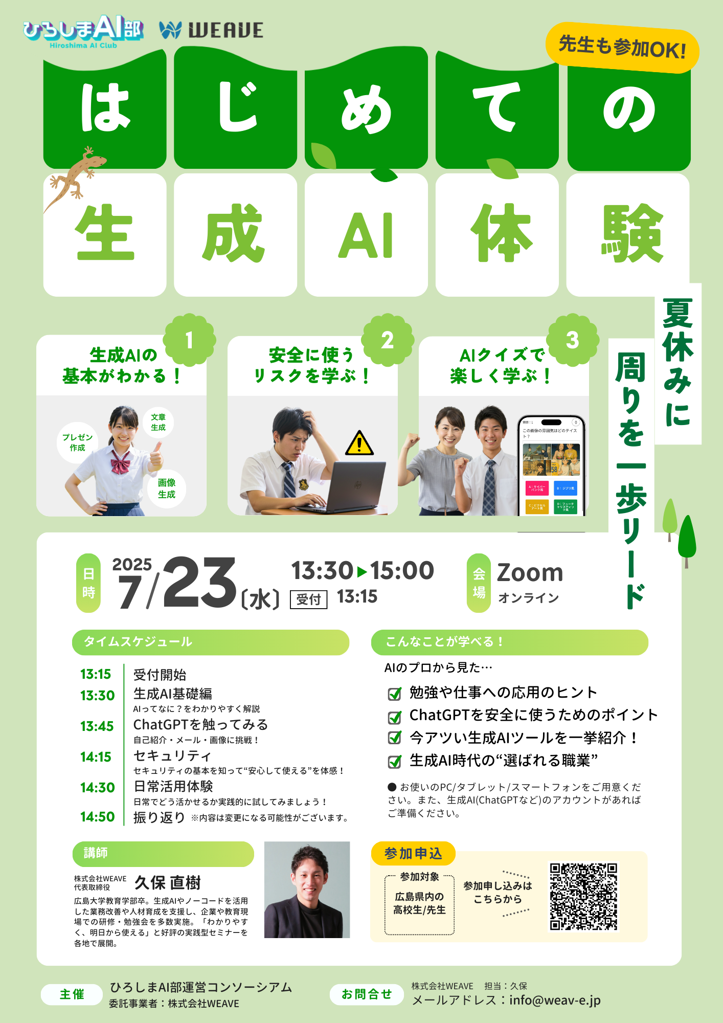 広島県の「ひろしまAI部」とWEAVEは2025年7月23日、県内の高校生・教員約30人向けに生成AIのオンライン体験イベントを開きました。参加後アンケートでは約9割が「勉強や学校生活で実際に活用したい」と回答しました。内容はChatGPTなどの基本操作に加え、文化祭・修学旅行の企画をAIで発想する演習、学習内容を4コマ漫画に整理するワーク、個人情報や機密を入力しないためのセキュリティ解説で構成。事前調査では生成AIの利用経験が「未経験」20%、「試した程度」20%、「既に活用」60%と差があり、幅広い層のリテラシー底上げを狙いました。今後は学校・自治体向け研修として展開を広げ、現場で使える運用ルールづくりや教材化が進むかが焦点です。