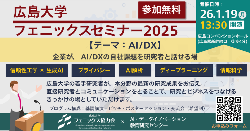 広島大学フェニックス協力会と広島大学AIDI教育研究センターは、AIとデジタルトランスフォーメーション(DX)をテーマにした研究成果発表会「フェニックスセミナー」を2026年1月19日(月)13時30分から開催します。会場は広島駅北口から徒歩4分の広島コンベンションホール大ホール3で、16時30分から17時30分には希望者向けの懇親会も予定されています。