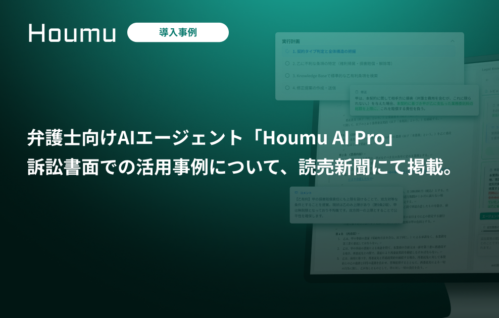 KenRi(東京都中央区)は、弁護士業務に特化したAIエージェントサービス「Houmu AI Pro」が、訴訟書面の作成支援(訴状原案・準備書面)や打ち合わせ時のAI議事録などで活用が進んでいると発信し、ユーザー取材内容が読売新聞の連載企画で紹介された。掲載の背景には、弁護士制度誕生から150年を迎えた節目がある。