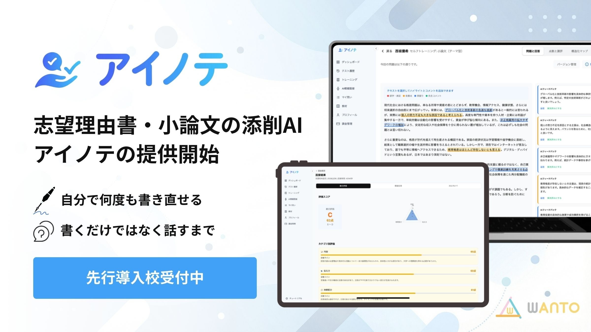 京都府亀岡市のWANTOは、志望理由書・小論文の作成プロセスを支援するAI添削サービス「アイノテ」を2026年3月に正式提供します。AI添削に加え、音声で対話するAI模擬面接と、段階的に学べる学習ロードマップの3機能を備えます。