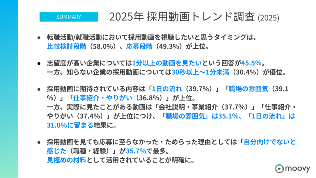 今後は、認知段階は短尺、選考後半は長尺の使い分け、年代や職種別に複数本を用意し、日常の具体描写と根拠提示、情報の更新性を高める運用が、見極めツールとしての機能強化に繋がるとみられます。