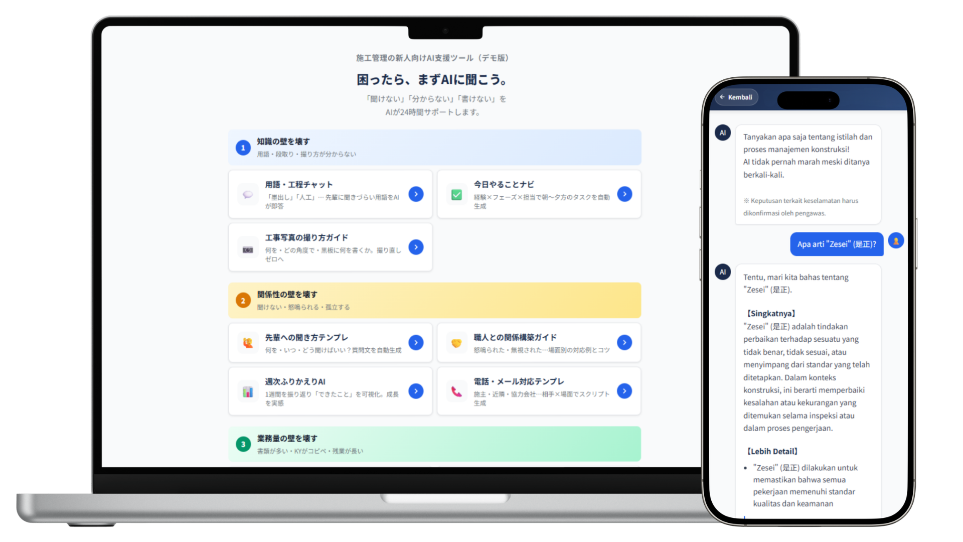 提供形態は生成AIによる教育型メンタリングのWebアプリ(PWA、スマホ最適化)で、日本語・ベトナム語・インドネシア語・やさしいにほんごの4言語に対応します。用語チャット、タスクナビ、日報自動生成、KY(危険予知)シート作成など11機能を搭載し、製品版ではRBAC(役割に応じた権限管理)の実装を予定しています。