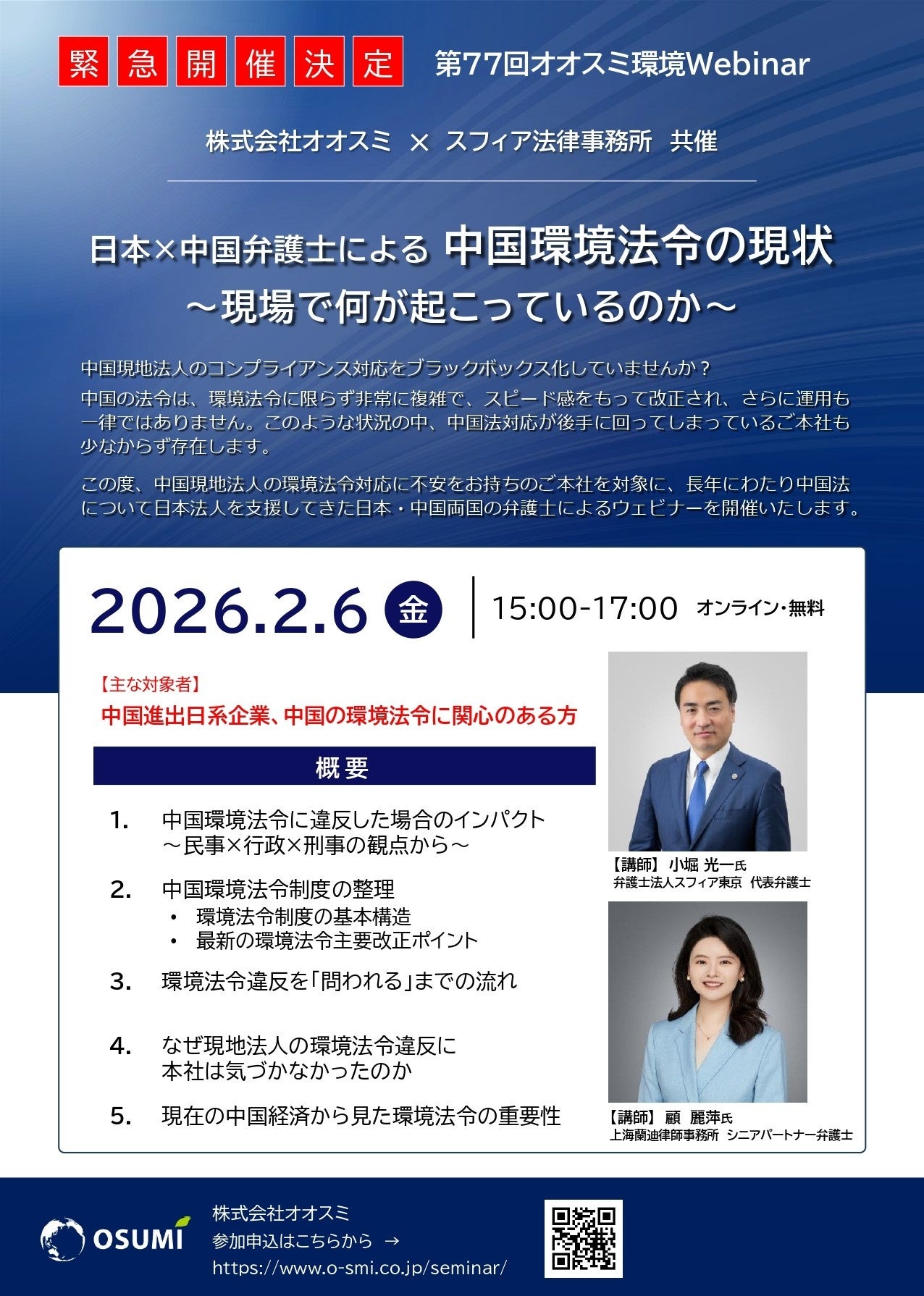 弁護士法人スフィア東京(東京都港区)は2026年2月6日15時〜17時、中国環境法令の現状と実務対応を扱うオンラインウェビナーを株式会社オオスミと共催し、第77回「オオスミ環境Webinar」として実施しました。日本本社から見えにくい現地対応の「ブラックボックス化」回避を論点に掲げました。