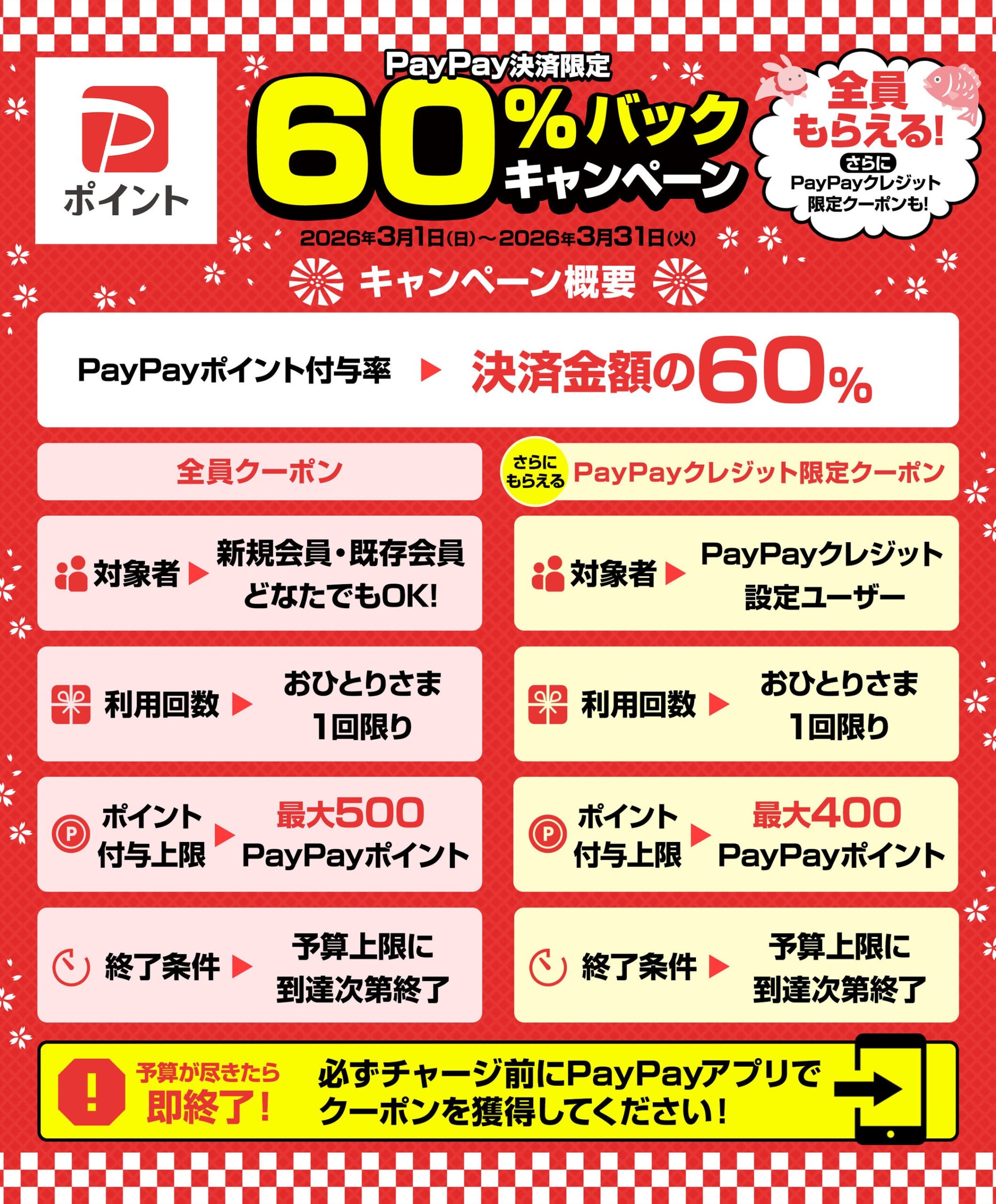 クーポン:全員もらえる(60%・最大500pt・1回)/PayPayクレジット限定(60%・最大400pt・1回)