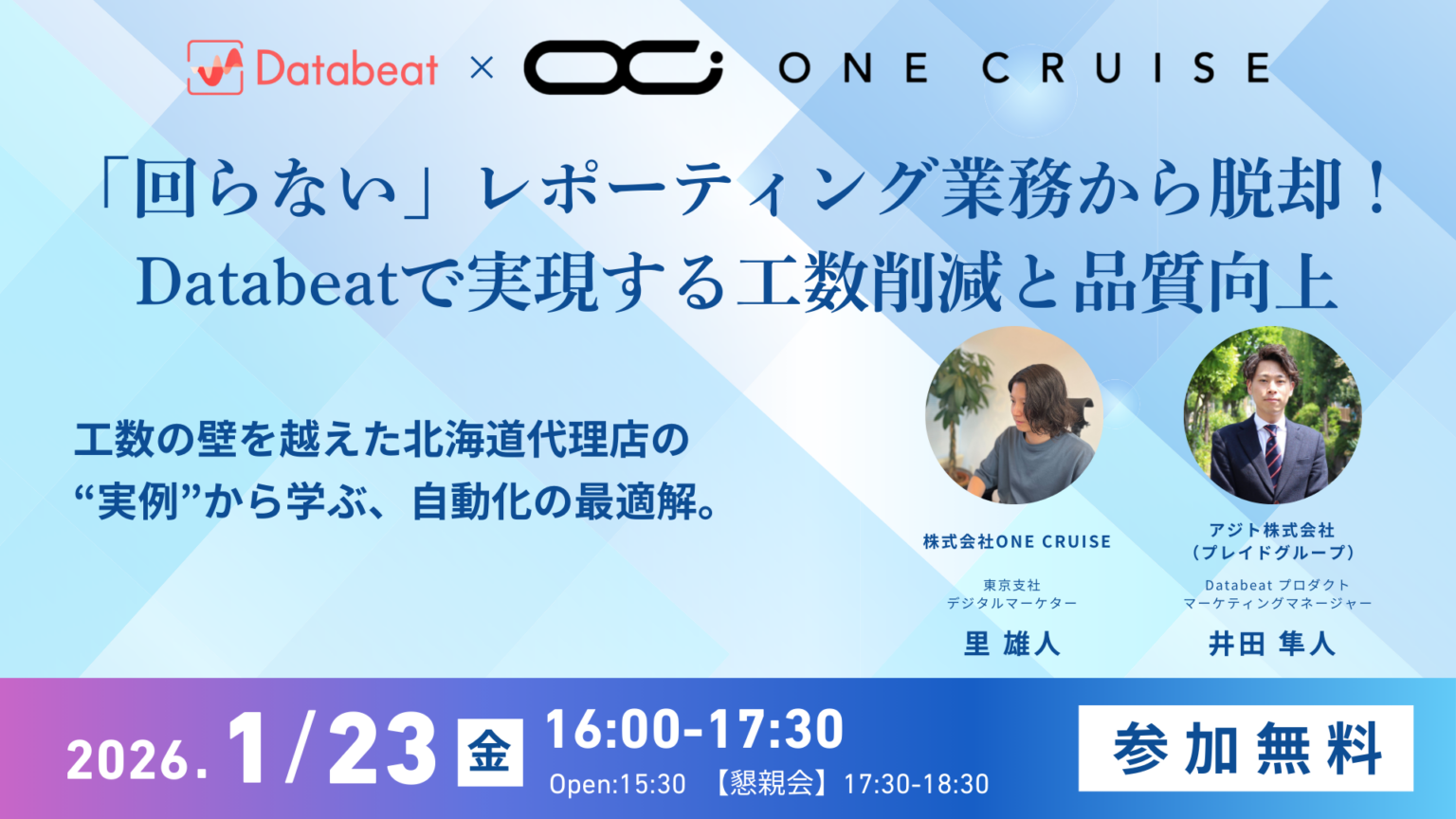 広告レポート自動化ツール「Databeat」を手がけるアジト(東京都千代田区)とWEBマーケ企業ONE CRUISE(札幌市)は、2026年1月23日(金)に札幌で共催セミナーを開き、レポーティング業務の工数削減と品質向上の進め方を紹介します。会場はTKP札幌北口カンファレンスセンターで、定員は50人、参加費は無料です。