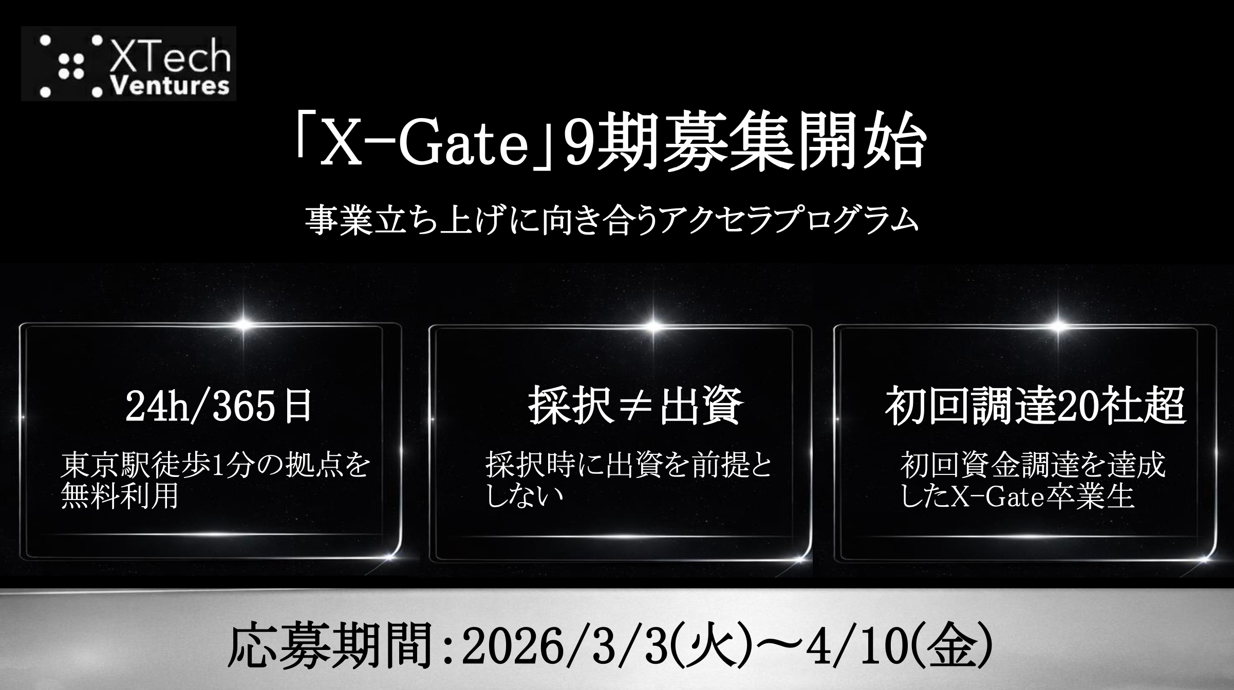 XTech Venturesは2026年3月3日18時、東京駅徒歩1分のシェアオフィス「xBridge – Yaesu」を拠点とするアクセラレーションプログラム「X-Gate」第9期の参加者募集を始めました。募集は4月10日までで、期間は約4カ月、採択時点での出資は前提としません。