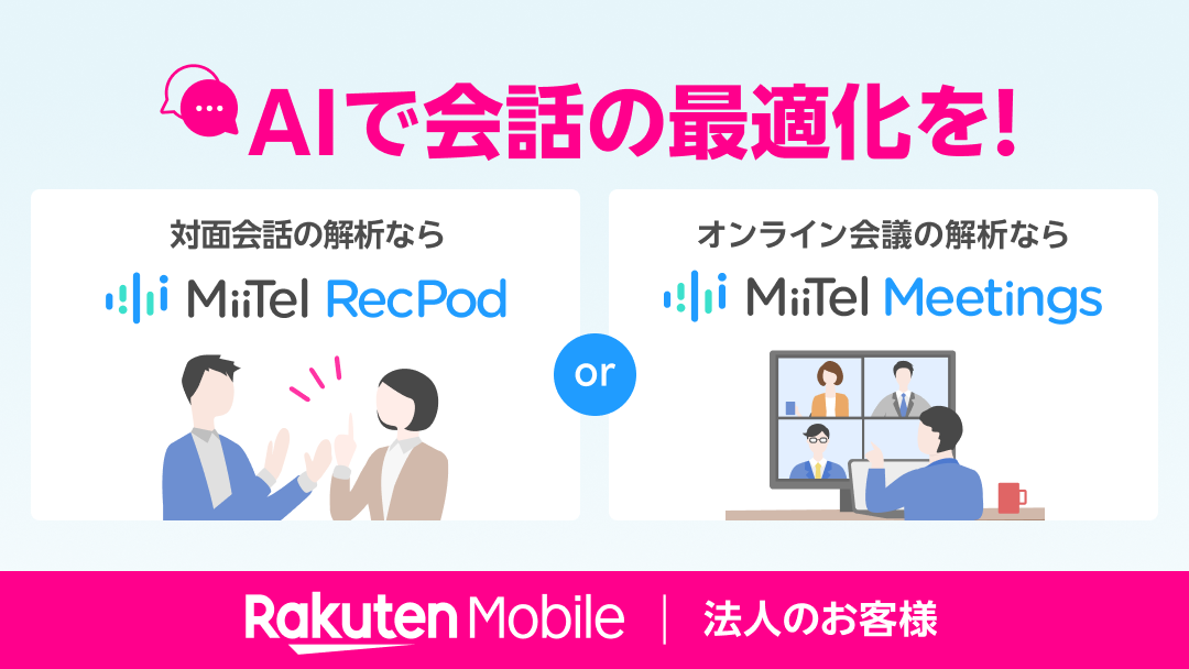 楽天モバイルは12月22日、法人向けに音声データを録音しAIで文字起こし・分析まで行う「MiiTel RecPod」と「MiiTel Meetings」の提供を始めました。料金はRecPodが1IDあたり月額10,032円(税込)から、Meetingsが同7,249円(税込)からです。対面の面談はスマホアプリで録音しアップロード、オンライン会議は会話を録音して話者分離の文字起こしや議事録生成を行います。分析では話速やトーク比率などを数値化し、感情認識・キーワード分析も使って会話の傾向を定量把握できます。さらに議事録共有や顧客管理システム、チャットツールへの自動アップロードで会話後の事務作業も軽減します。解析可能時間は1IDにつき40時間、データ保存は13カ月までで、開発・提供はRevCommです。楽天モバイルは今後も法人のDX支援としてAIサービス拡充を進める考えです。
