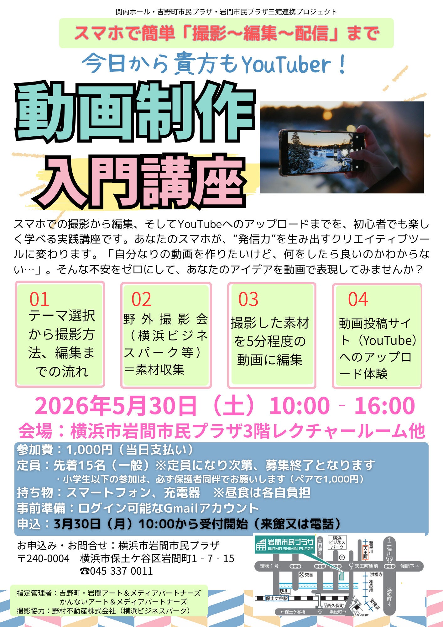 横浜市岩間市民プラザ(横浜市保土ケ谷区)で2026年5月30日10時~16時、スマートフォンで「撮影~編集~配信」までを学ぶ動画制作入門講座が開かれます。参加費は1,000円(当日支払い)、定員は先着15人で、申込受付は3月30日10時開始です。