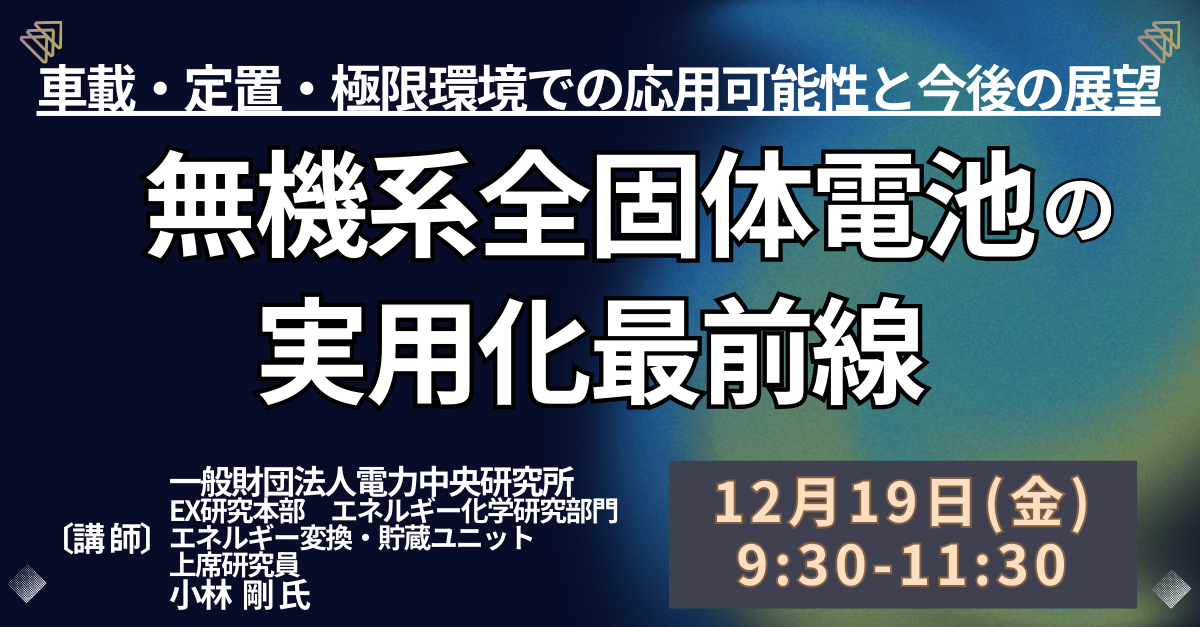 講師は一般財団法人電力中央研究所EX研究本部エネルギー化学研究部門の上席研究員・小林剛氏で、次世代蓄電技術として注目される「無機系全固体電池」の最新動向を解説します。無機系全固体電池は、電解液の代わりに固体電解質を用いることで安全性向上や高エネルギー密度が期待されており、材料としては酸化物系と硫化物系の2種類が主に研究されています。