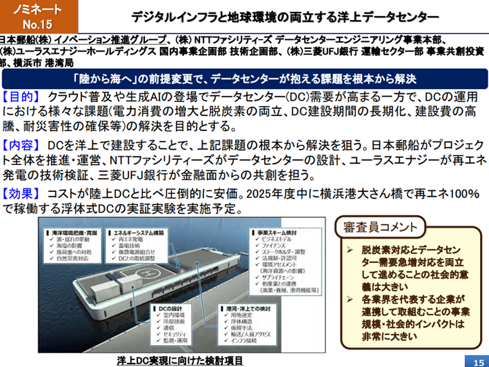 ユーラスエナジーホールディングスなど5者が共同検討する「洋上浮体型データセンター」が2月9日、日本オープンイノベーション大賞の総務大臣賞を受賞しました。横浜港大さん橋ふ頭で2025年度中に実証実験を始め、再生可能エネルギー100%で稼働するデータセンターの検証を進めます。