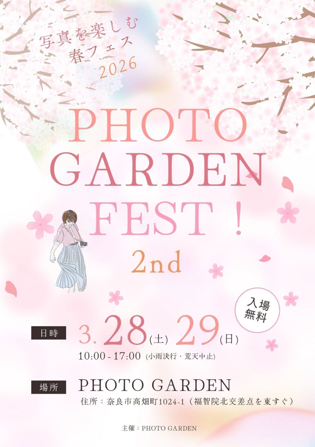 株式会社焦点工房(愛知県名古屋市)は、写真イベント「PHOTO GARDEN FEST!2nd」に3月28日(土)の10:00〜17:00に出展し、希少レンズやアウトレット品を特別価格で数量限定販売します。会場は奈良県奈良市高畑町1024-1のPHOTO GARDEN 1Fギャラリーです。