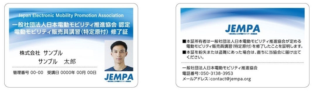 研修は訪問型の集合形式で、JEMPA認定講師が企業指定会場に出向きます。内容は制度・交通ルール、法定説明事項、年齢確認、ナンバー登録や自賠責保険の案内、走行場所と違反時リスクの伝え方に加え、EC販売時の表示・説明方法、質問対応やクレーム事例まで含み、修了者にはカード型の「JEMPA認定販売員証」を発行します。