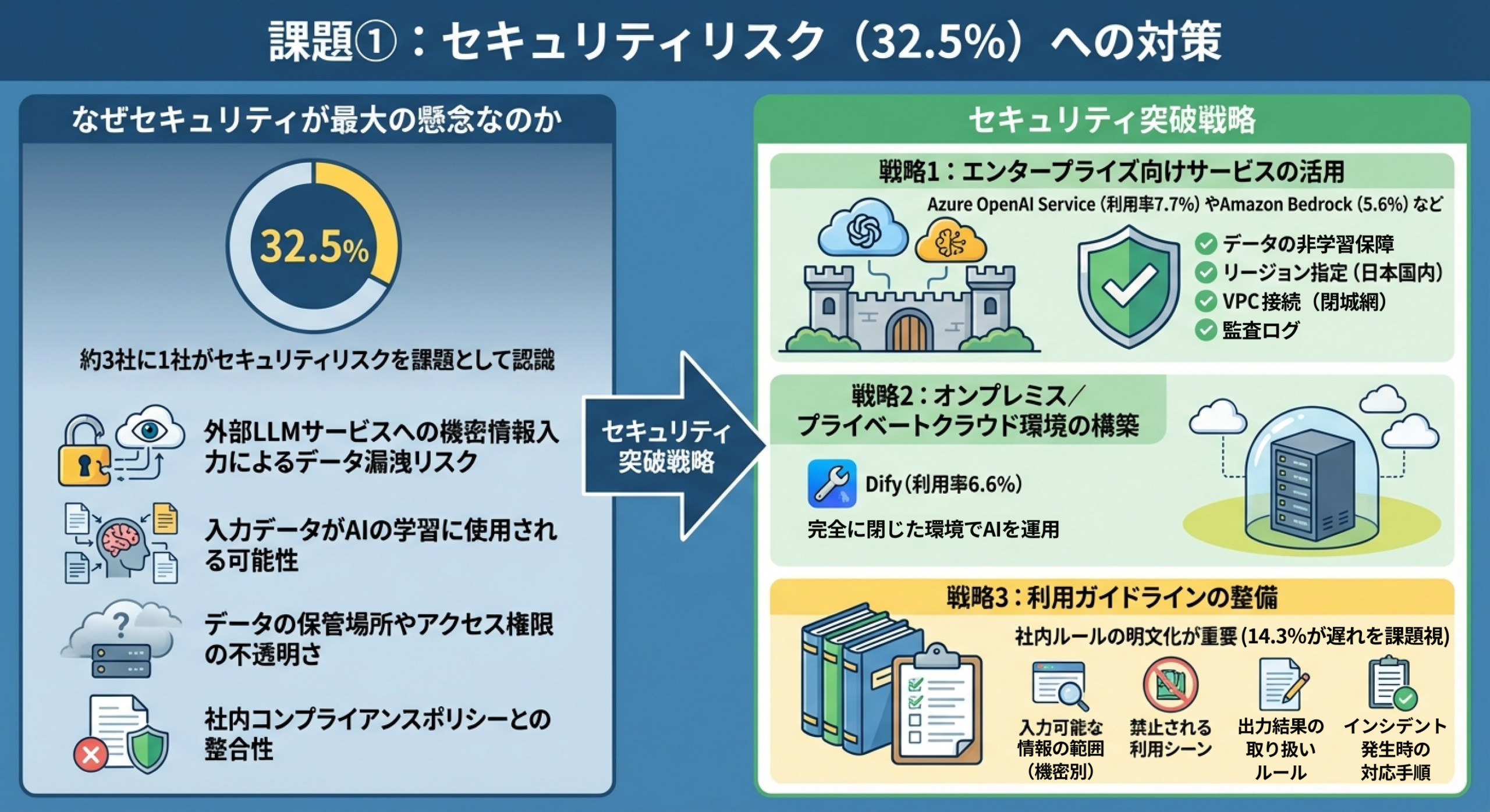 課題の上位は次いで「従業員のリテラシー・スキル不足」24.3%、「出力精度の不確実性(ハルシネーション=もっともらしい誤情報の生成)」27.0%、「著作権・コンプライアンスの法的懸念」23.0%、「費用対効果(ROI)の算出・評価が困難」17.7%でした。機密情報を外部の大規模言語モデル(LLM)に入力することによる漏洩や、入力データが学習に使われる可能性、データ保管場所や権限管理の不透明さなどが、導入判断の重荷になっているといいます。