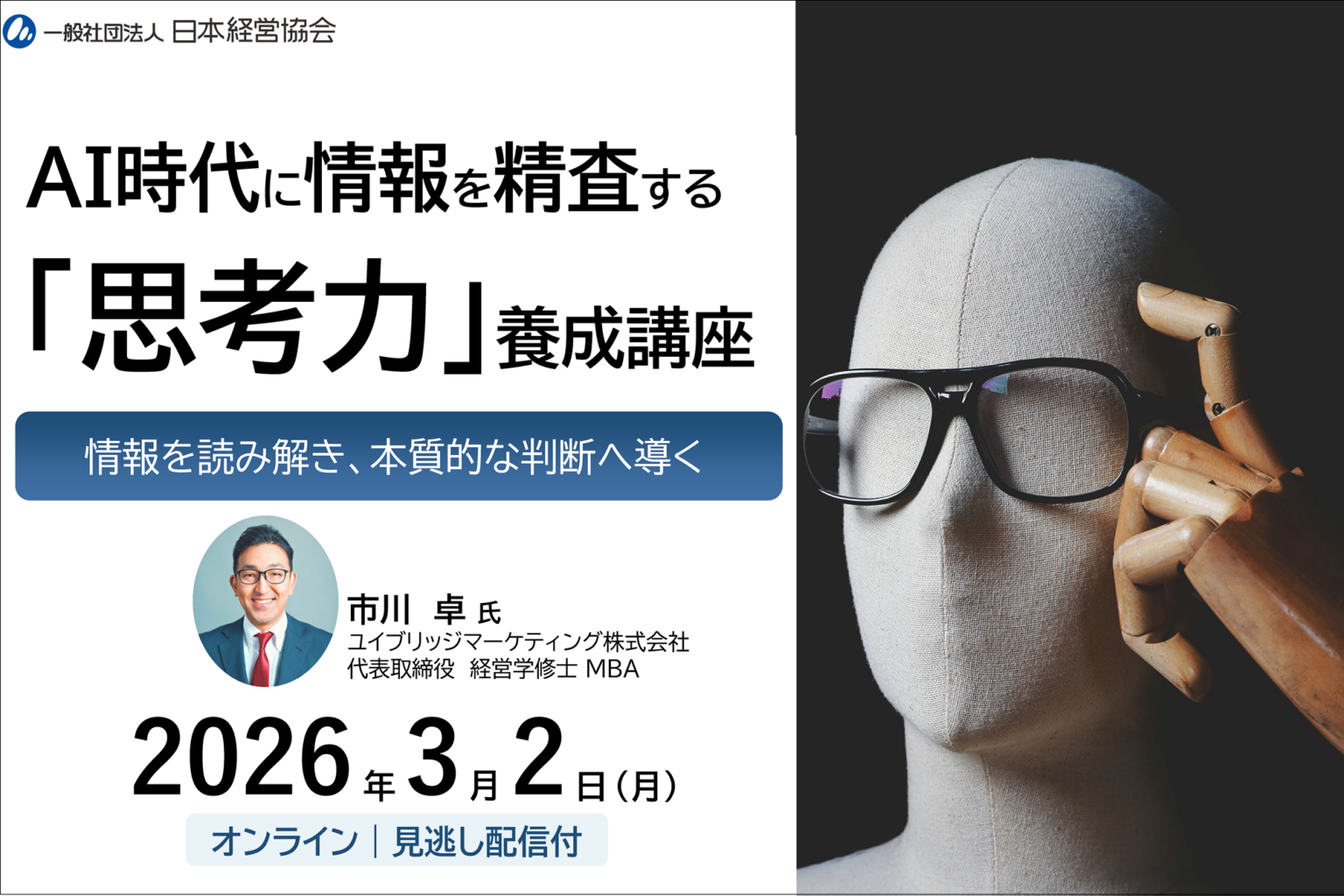日本経営協会(東京都渋谷区)は、情報を精査して判断につなげる「思考力」を学ぶオンライン講座を2026年3月2日10:00~16:00に実施します。受講料は会員35,200円、一般42,900円(税込)です。