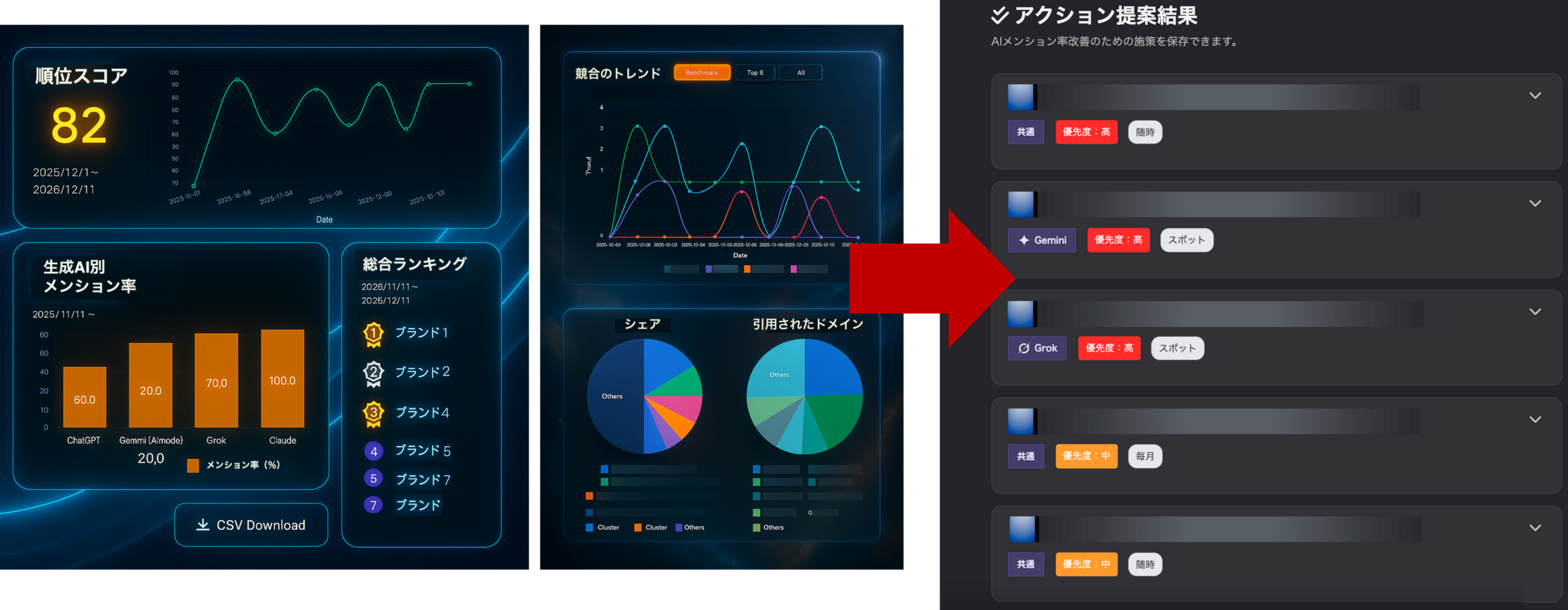 プラッタ(千葉県柏市)は2025年12月16日、LLMO・AIO対策ツール「SUPER ACT」に、生成AI上の分析結果からメンション率向上に向けた最適化アクションをAIが自動提案する新機能「Action Board」の提供を始めました。対象はChatGPT、Gemini、Grok、Claude、Perplexityなどで、提案を管理画面で一元管理できます。