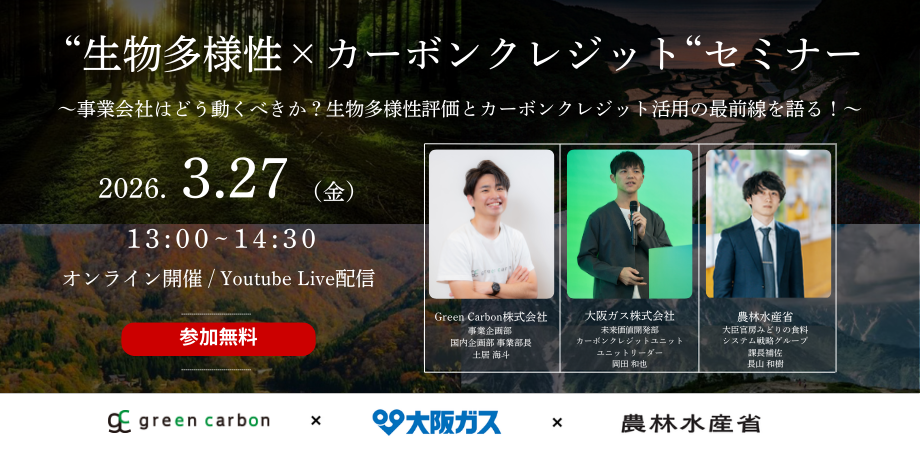 Green Carbonは3月27日13時〜14時30分、大阪ガスと農林水産省と共に「生物多様性×カーボンクレジット」をテーマにした無料オンラインセミナーをYouTube Liveで配信します。事前登録はPeatixで受け付け、後日アーカイブ配信も予定します。
