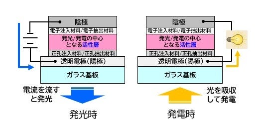 発光は電気を光に変え、発電は光を電気に変える逆の過程のため、同一素子で両立しにくいのが課題でした。今回、発光効率と強い光吸収を兼ね備える材料を活性層に用い、素子内部のエネルギーや電荷の挙動を精密に制御することで、発光/発電の切り替え動作を可能にしたといいます。