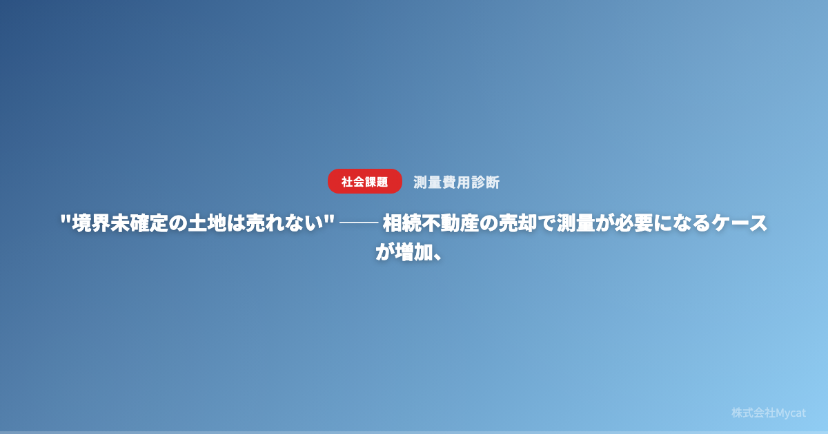 株式会社Mycat(東京都目黒区)は2026年3月20日、相続不動産の売却で障壁になりやすい測量費用を短時間で見積もれる「測量費用診断」の費用算出機能を強化した。土地面積・形状・隣接地情報を入力すると、確定測量の概算費用を30秒で算出し、診断実績は累計1,200件超としている。