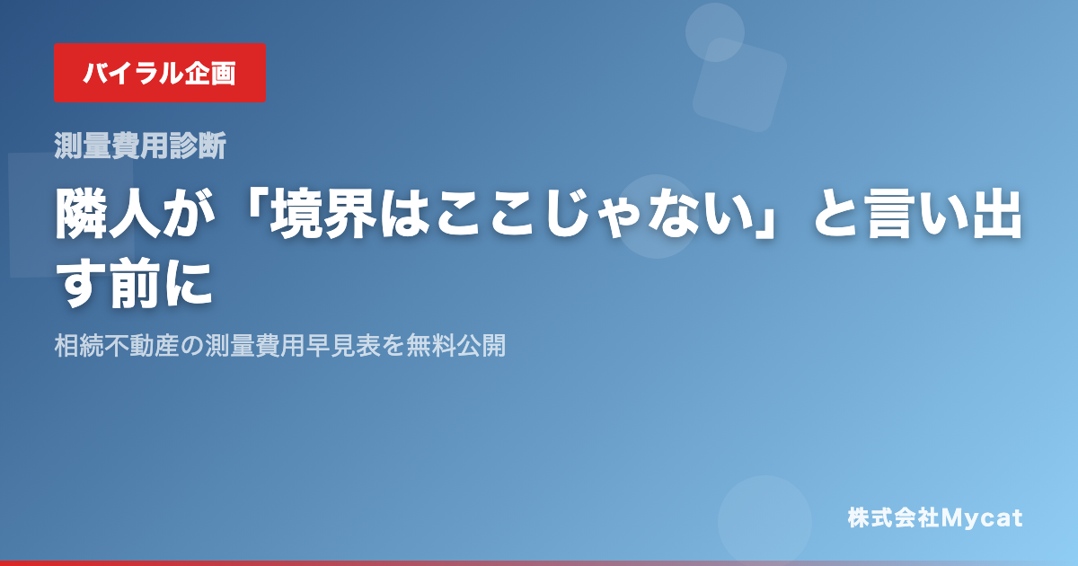 株式会社Mycat(東京都目黒区)は2026年3月19日、相続不動産の測量費用の不透明さを減らす無料ツール「測量費用AI早見表」の提供を始めました。所在地・面積・隣接地の数など4項目を入力すると、測量3種別の費用目安、所要期間目安、境界トラブルのリスク判定を即時に表示します。