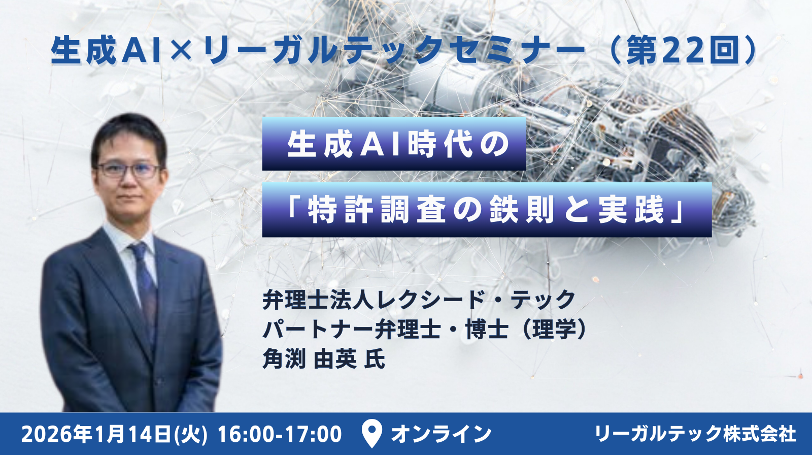 知財×AIリーガルテックセミナー第22回が、2026年1月14日(水)16:00〜17:00にオンライン(Teams)で開催されます。登壇は角渕由英弁理士。生成AIを用いた先行技術調査の精度向上とリスク低減を、デモを交えて60分で解説します。