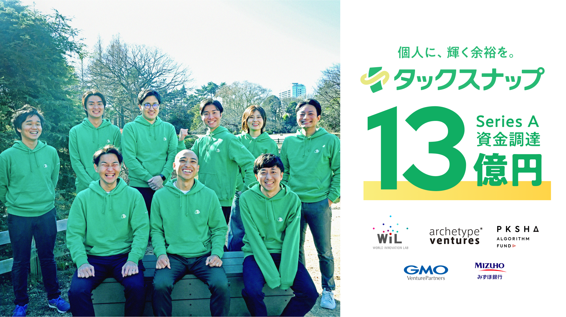 確定申告アプリ「タックスナップ」を手がけるタックスナップ(東京都杉並区)は、シリーズAで13億円を調達しました。累計調達額は約16億円です。出資は第三者割当増資、資金にはみずほ銀行など金融機関からの融資も含まれ、リード投資家はWiL(World Innovation Lab)です。調達資金はマーケティング、機能拡充、採用に充てます。