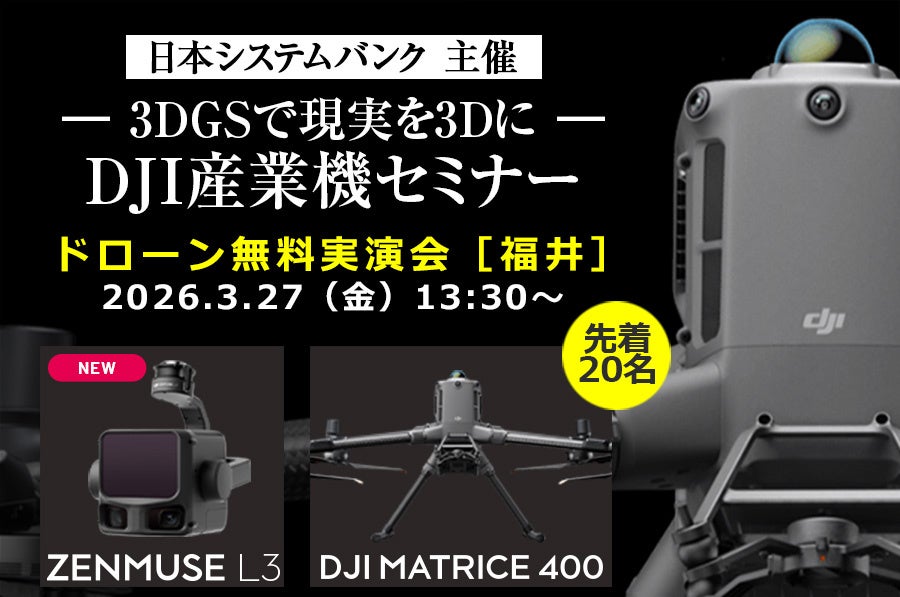 セキド(東京都港区)は3月27日(金)13時30分〜15時30分、福井市の美山アンデパンダン広場で、測量・点検・施設管理向けに現場の3Dデータ化を学ぶ「【3DGSで現実を3Dに】DJI産業機セミナー」を協力開催します。参加費は無料で、定員は先着20名です。主催は日本システムバンク株式会社です。