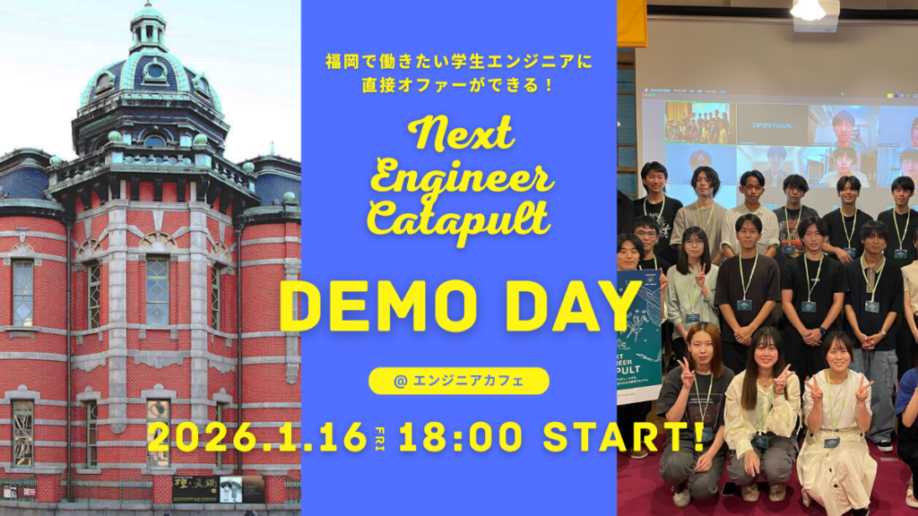 福岡市内で働きたい学生エンジニアと、市内に開発拠点を持つ企業を直接マッチングする最終成果発表会「DEMO DAY」が、2026年1月16日18時から20時30分まで福岡市中央区のエンジニアカフェとオンラインで開かれます。学生8チームが約1.5カ月かけて開発したデータ活用アプリを発表し、観覧企業はその場で有給インターンシップをオファーできます。企業観覧エントリーの締め切りは1月14日です。