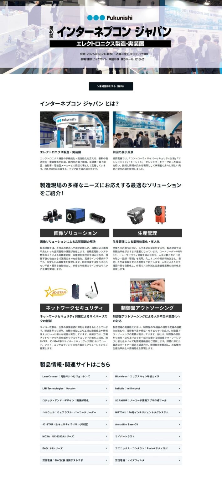 福西電機株式会社(大阪市北区)は、2026年1月21日(水)〜23日(金)に開催される「第40回 インターネプコン ジャパン」への出展に向け、展示内容をまとめた専用の出展情報ページを公開しました。ページ上で展示内容、展示製品情報、関連外部サイトへのリンク、資料ダウンロードを一括で確認できます。同社は電設資材や電子機器、制御・通信機器などのエレクトロニクス商材を扱う企業で、資本金は16億3,200万円です。来場前に情報を整理しやすくすることで、会期中のブースでの体験を効率化する狙いがあるとみられます。ブースでは製造現場の多様なニーズに応える「最適なソリューション」の体験機会を提供し、課題解決への貢献を目指すとしています。今後は、来場者の関心分野に応じた導入検討が進むかが焦点となります。【イベント情報】