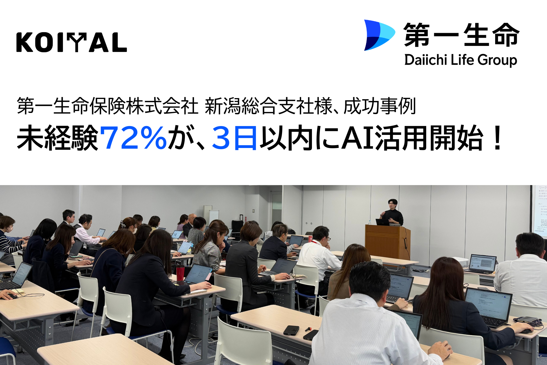 KOIYALは2026年1月7日、第一生命保険の新潟総合支社(新潟市)でビジネス職社員約90人向けに、Microsoft Copilot Chatなど生成AIの業務活用研修をハイブリッドで実施しました。研修後アンケートでは、受講前にAI未経験だった人が72%でした。