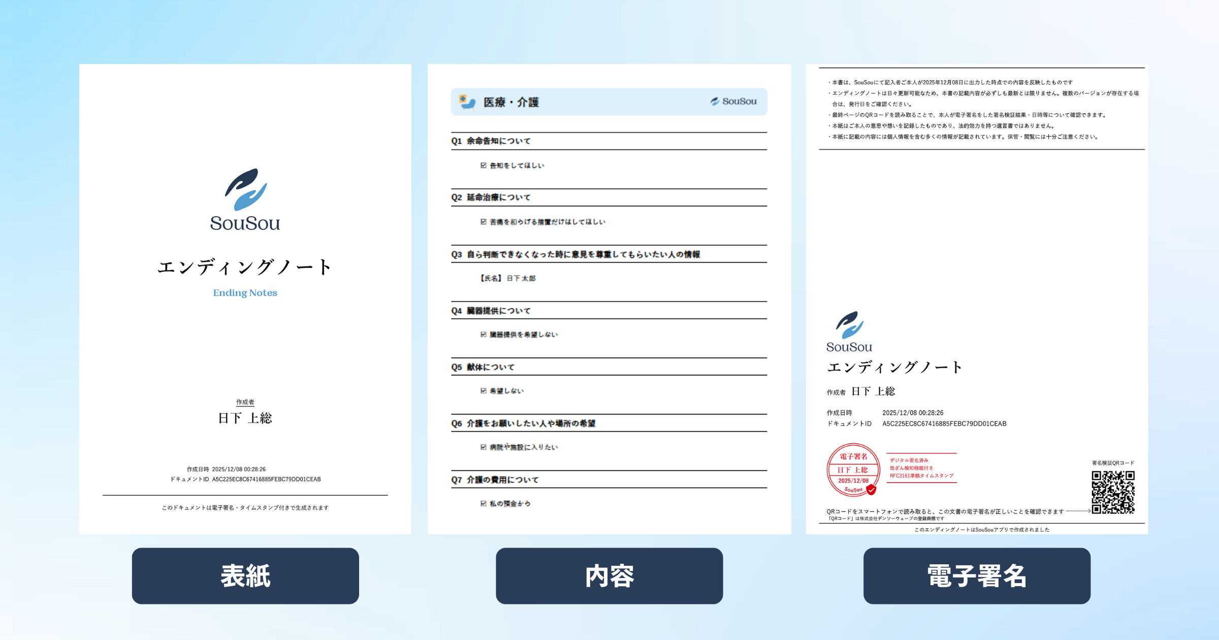 終活アプリ「SouSou」は12月19日、本人確認を済ませた利用者向けに、入力したエンディングノートをA4縦のPDFで出力できる機能を追加しました。PDF出力時に電子署名の入力を必須とし、「本人がいつ作成した文書か」を後から検証できる設計です。最終ページには署名検証用QRコードを載せ、読み取りで検証結果と署名日時を確認できます。背景には「端末解約でデータが消えるのでは」「紙のように家族へ渡したい」といった声があり、クラウド保管に加えて手元保管やアプリ未利用の家族との共有をしやすくします。なお、出力範囲は設問カテゴリ単位で選択できる一方、ユーザーが追加したオリジナル質問は対象外で、PDFは遺言書ではなく法的効力は持ちません。今後はデジタルの利便性と従来の安心感を両立する機能拡充を進めるとしています。