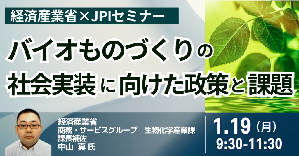 日本計画研究所(JPI)は2026年1月19日9時30分〜11時30分、経済産業省 商務・サービスグループ 生物化学産業課の中山真氏(課長補佐)を講師に招き、「バイオものづくりの社会実装に向けた政策と課題」をテーマとするセミナーを開催します。受講料は1人37,860円(税込)で、会場受講・ライブ配信・2週間のアーカイブ配信から選べます。