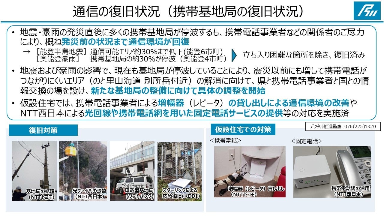 一方、地震・豪雨後も停波が残る地点があり、震災前からつながりにくい「のと里山海道」別所岳付近では、県・携帯各社・国が情報交換の場を設け、新基地局整備に向けた調整を開始しました。仮設住宅では電波増幅器(レピータ)の貸し出しや固定電話サービス提供などで補完します。