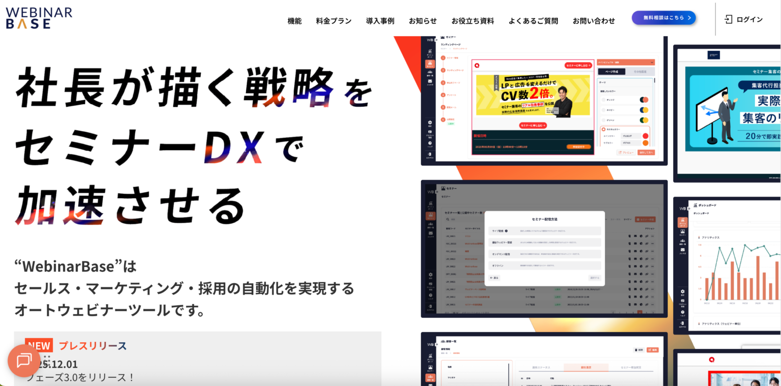 WebinarBaseは、ランディングページ作成、メール配信、顧客管理(CRM=顧客情報を一元管理し営業・マーケティングに活用する仕組み)など、分散しがちなウェビナー業務を一つに統合。24時間365日の自動運用に対応し、申込率や視聴率、離脱率などの指標を分析画面で確認できる。顧客数は四半期ごとに200%成長したとしている。